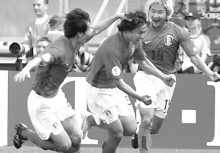 - 지난 6월13일 토고와의 1차전에서 후반 27분 극적인 역전골을 터뜨린 안정환(가운데)이 동점골을 넣은 이천수, 송종국과 함께 환희의 골 세리머니를 펼치고 있다.