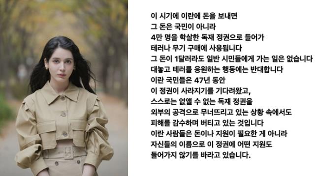 한국에서 활동 중인 ‘미스 이란’ 출신 모델 호다 니쿠가 한국 정부의 대이란 인도적 지원 결정에 반대 입장을 드러냈다.