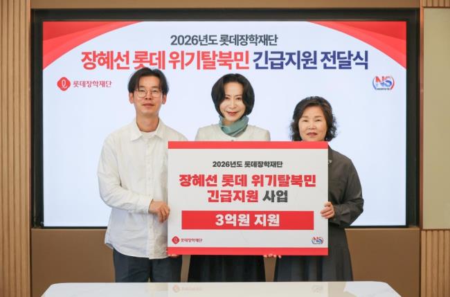 롯데장학재단(이사장 장혜선)은 ‘2026년 장혜선 롯데 위기 탈북민 긴급지원 사업’ 전달식을 열고 3억 원의 지원금을 전달했다고 밝혔다.