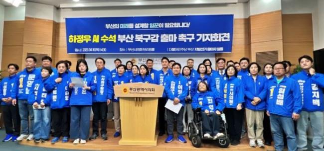 - 더불어민주당 지방선거 출마자들이 16일 부산시의회 브리핑룸에서 기자회견을 열고 부산 북구갑 국회의원 보궐선거에 하정우 청와대 AI미래기획수석의 출마를 촉구했다. 사진=뉴시스