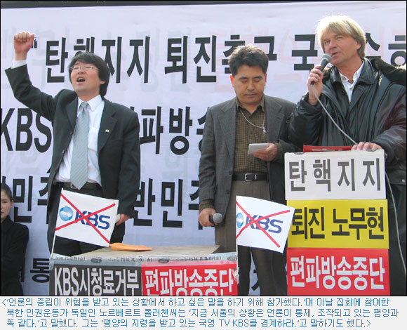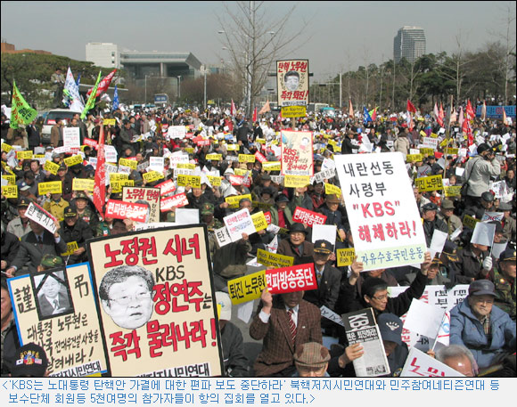 바른선택국민행동, 자유시민연대등 300여개 단체로 구성된 ‘노무현 대통령 탄핵지지 국민연대’ (대표 임광규) 회원등 5천여명은 19일 오후 2시 서울 여의도 KBS 본관 앞에서 ‘국민의 공적 KBS 응징 국민대회’를 가졌다.