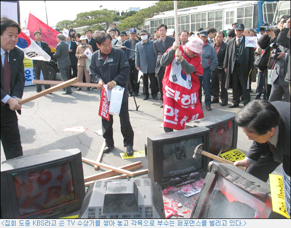 집회 장소 곳곳에는 ’노무현 정권의 나팔수 KBS', ‘사당(私黨) 방송국 자폭하라‘등의 플래카드를 내걸었다. 참가자들은 KBS란 글씨에 X자 표시를 한 깃발을 흔들며 ’KBS는 여론 선동 중지하고 정연주 사장은 물러나라.‘ ’탄핵반대 여론 조작하는 KBS를 끝장내자.‘란 구호를 외쳤으며 ‘영어로 NO KBS,' ’시청료를 거부한다.’등의 구호가 적힌 TV 6대를 각목으로 부수는 퍼포먼스도 벌렸다.