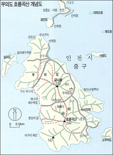 무의도는 영종도 인천신공항 서쪽 끝에 있다. 인천신공항은 영종도와 용유도는 섬 사이 바다를 ‘벽해상전(碧海桑田)’으로 바꿔 비행장을 닦았다. 동북아시아의 중심공항으로 그 역할을 다할 인천신공항은 영종도와 용유도, 그사이 작은 섬인 신불도와 삼목도를 연결하는 총연장 17.3km의 방조제를 쌓아 조성한 1,700만평의 부지에 건설됐다. 서울 여의도 면적의 18배나 된다. 반 인공섬인 영종도 바로 코앞에 무의도에는 서해의 알프스라 불리우는 호룡곡산(虎龍谷山, 244m)과 국사봉(國師峰, 230m)이 있다.