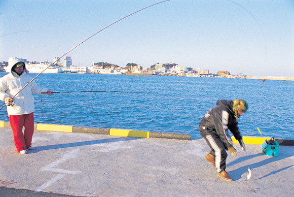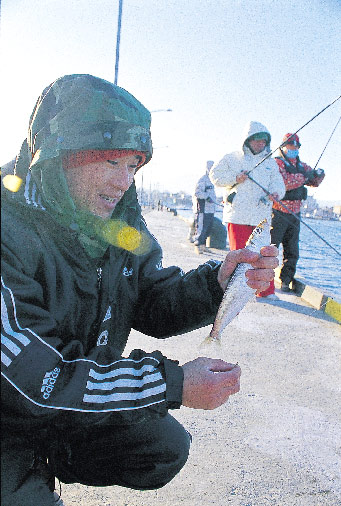 청호동 신등대 방파제 끝머리 일대가 속초항 청어낚시의 포인트. 순간에 누구보다도 많이 낚으려면 밑밥을 주면서 낚아야 한다. 아침부터 기다렸다가 오후 4시가 넘어서 청어떼를 낚기 사작한 최재철씨의 기쁨.