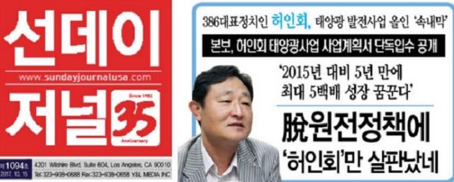 12일 《선데이저널》은 이른바 '386세대 대표 정치인'으로 꼽히는 허인회 전 열린우리당 청년위원장이 주도하는 '태양광사업'에 대한 내막을 보도했다. 해당 언론은 허 전 위원장의 태양광사업 사업계획서를 단독입수해 공개했다.
