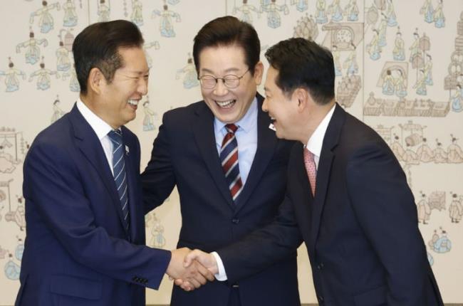 - ÀÌÀç¸í ´ëÅë·ÉÀÌ 8ÀÏ ¼¿ï ¿ë»ê ´ëÅë·É½Ç û»ç¿¡¼ ¿¸° ¿©¾ß ÁöµµºÎ ¿ÀÂù ȸµ¿¿¡ ¾Õ¼ Á¤Ã»·¡ ´õºÒ¾î¹ÎÁÖ´ç ´ëÇ¥¿Í À嵿Çõ ±¹¹ÎÀÇÈû ´ëÇ¥ÀÇ ¾Ç¼ö ¸ð½ÀÀ» º¸¸ç ¹à°Ô ¿ô°í ÀÖ´Ù. »çÁø=´º½Ã½º