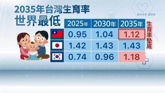 ´ë¸¸ ±¹°¡°³¹ßÀ§¿øÈ¸(NDC)´Â 2035³â ´ë¸¸ÀÇ ÇÕ°èÃâ»êÀ²(TFR)ÀÌ Çѱ¹À» Ãß¿ùÇØ ¼¼°è ÃÖÀú(1.12)¸¦ ±â·ÏÇÒ °ÍÀ¸·Î ÃßÁ¤Çß´Ù. 2025³â ´ë¸¸ 0.95, Çѱ¹ 0.74·Î Çѱ¹ÀÌ ³·Áö¸¸, 2030³â ´ë¸¸ 1.04¿¡µµ ºÒ±¸Çϰí 2035³â Çѱ¹¿¡ ¹Ð·Á ÃÖÀú°¡ µÉ Àü¸ÁÀÌ´Ù.
