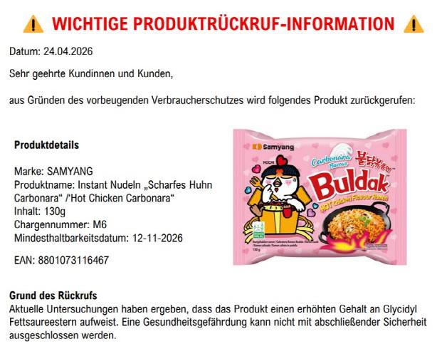 27일 독일 정부가 운영하는 국가 공인 식품‧소비재 안전 경고 및 리콜 포털 레벤스미텔바르눙(Lebensmittelwarnung)은 삼양식품 까르보불닭볶음면이 글리시딜 지방산 에스테르 기준치를 초과해 리콜 명단에 올랐다고 밝혔다.