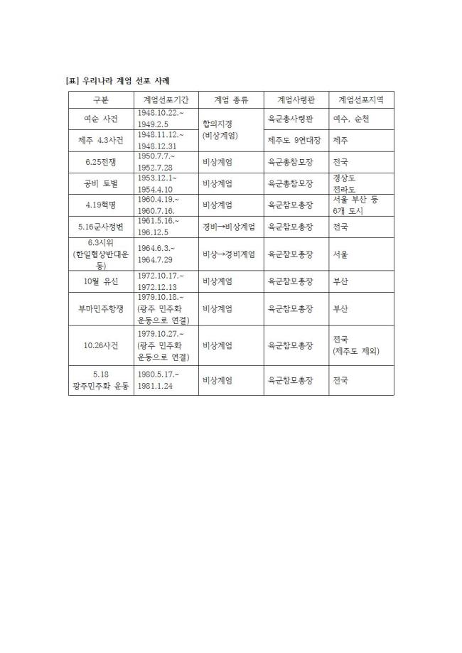 여섯째, 계엄선포 이전과 해제 이후의 민간인의 행위에 대한 군사법원의 관할에 관한 문제 등 헌법과의 관계에서 현행 계엄법은 몇 가지 중대한 법리적 문제가 있다. 위헌 소지가 있는 계엄법 조항은 반드시 해결해야 한다.