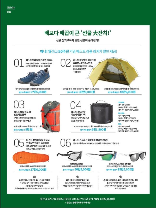 월간 <山> 이 창간 50주년을 맞아 신규 정기구독자를 위한 '선물대잔치'를 마련했다. 준비한 특전은 총 네 가지로, 등산인들에게 꼭 필요한 아이템들을 꼼꼼하게 챙겼다.