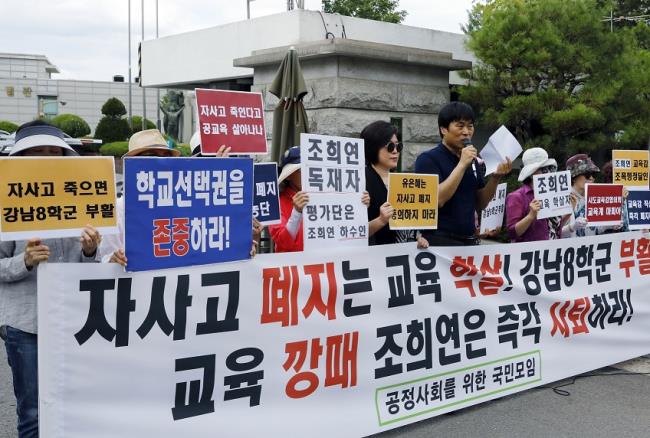 - 공정사회를 위한 국민모임 회원들이 9일 서울 종로구 서울시교육청 앞에서 자사고 폐지 반대 기자회견을 하고 있다. 사진=뉴시스