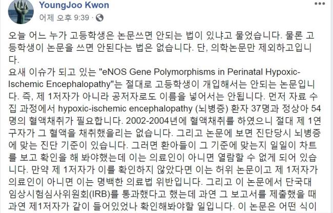 가톨릭의대 출신으로 현직 소아청소년과 의사인 권영주씨는 8월 22일 자신의 페이스북에 올린 글에서 요새 이슈가 되고 있는 "eNOS Gene Polymorphisms in Perinatal Hypoxic-Ischemic Encephalopathy"는 절대로 고등학생이 개입해서는 안 되는 논문으로 제1저자가 아니라 공저자로도 이름을 넣어서는 안 된다“면서 의료법 및 생명윤리 및 안전에 관한 법률 위반 가능성을 제기했다.
