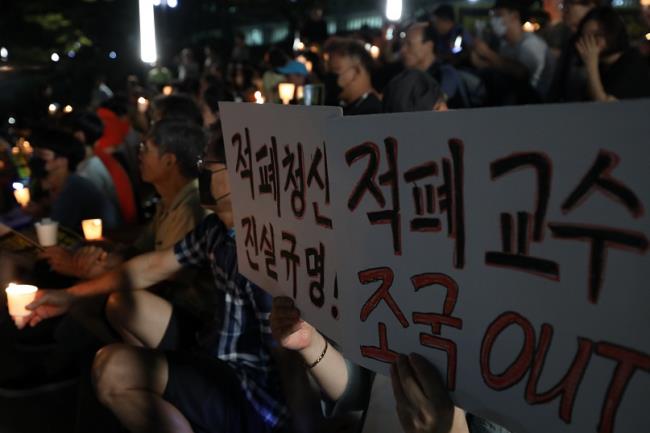 - 지난 23일 서울대에서 열린 조국 후보자 사퇴 요구 집회에서 참가자들이 피켓과 촛불을 들고 있다. 사진=뉴시스