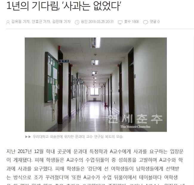 연세대 학보인 <연세춘추> 3월 25일 자에 따르면 문과대 A교수의 수업 및 뒤풀이 중 성희롱 사례가 다수 발생했으며, 피해 학생들은 사과를 요구했다. 2017년 3월의 일이다. 피해 학생들은 ‘강단에 선 여학생들이 남학생들에게 선택받는 방식으로 조가 꾸려졌다’며 ‘또 A교수가 수업 뒤풀이에서 테이블마다 여학생을 한 명씩 앉게 했고 춤을 추라고 요구했다’고 주장했다.