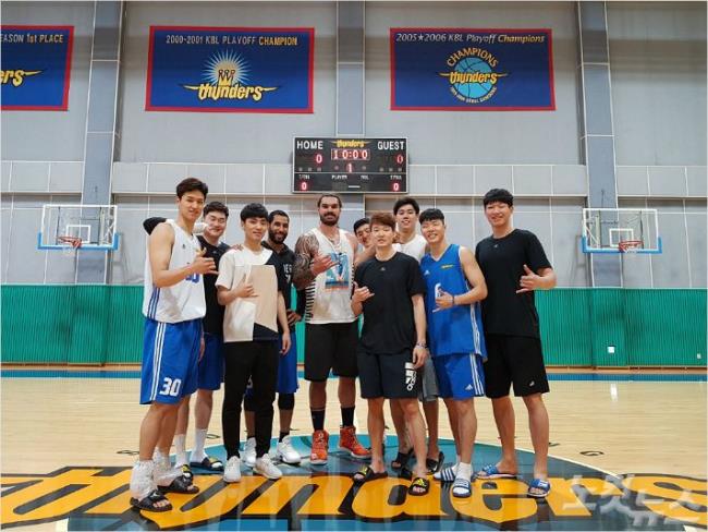 - 프로농구 서울 삼성 썬더스 선수들이 한국을 방문한 미국프로농구(NBA) 오클라호마시티 선더의 스티븐 애덤스와 기념 촬영을 하고 있다. 사진 제공=서울 삼성 썬더스 구단