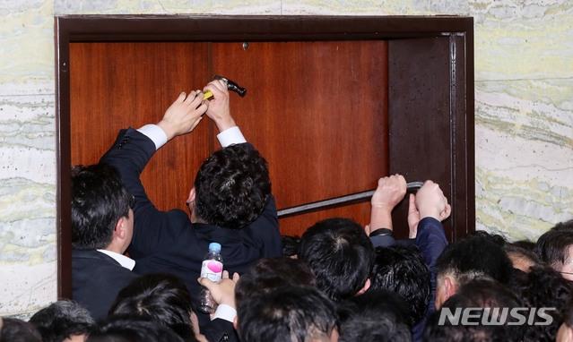 - 26일 새벽 서울 여의도 국회 본청 의안과 앞에서 국회 관계자들이 패스트트랙 지정안건 법안제출을 위해 진입을 시도하고 있다. 사진=뉴시스