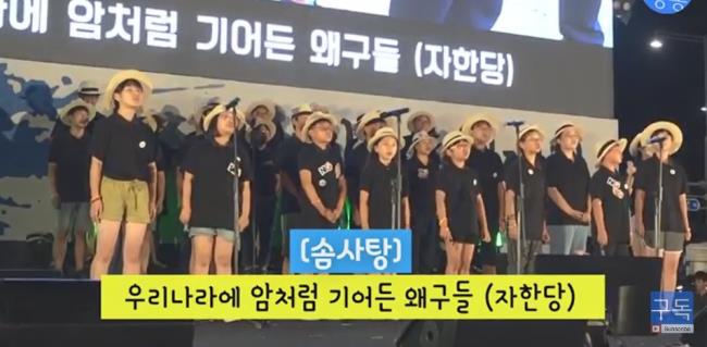 청소년들이 서울 한복판에서 열린 진보단체 대회에서 "자유한국당 해체 동요-만화 주제가 메들리'를 불러 논란이 되고 있다.
