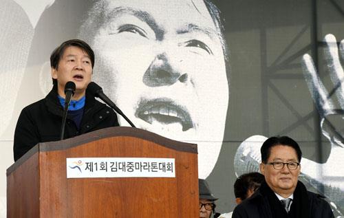- 2017년 12월 10일 전남 목포시 김대중 노벨평화상 기념관 일대에서 열린 제1회 김대중 마라톤대회에서 당시 안철수 국민의당 대표가 김대중 전 대통령 사진 앞에서 축사를 하고 있다. 사진=뉴시스