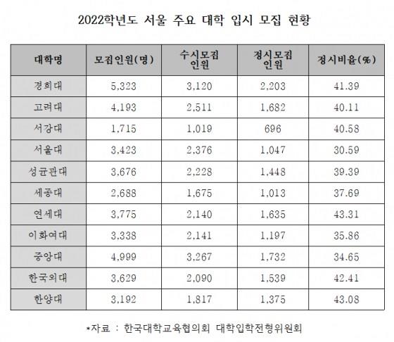 현 고교 2학년생이 내년에 치를 2022학년도 대학 입시부터 서울 소재 주요 대학들의 정시모집 비율이 모두 30% 이상으로 올라간다.