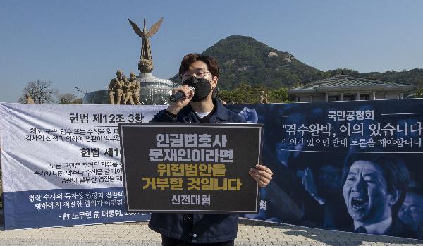 - 대학생단체인 신전대협은 5월3일 청와대 앞에서 검수완박법이 위헌이라고 주장하며 문재인 대통령에게 거부권 행사를 촉구했다. 사진=조선DB