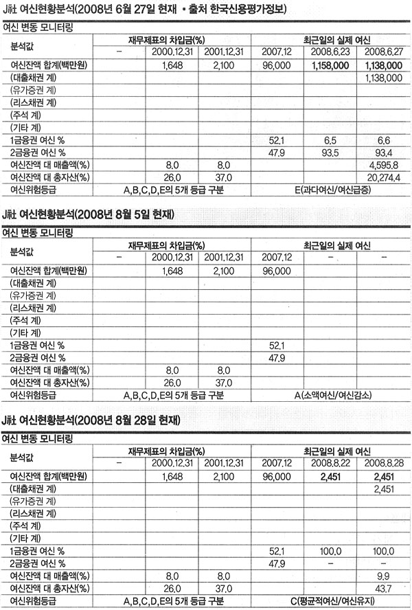 º¸°í¼¿¡ µû¸£¸é, J»ç´Â 2007³â 12¿ù 960¾ï¿ø(1¡¤2±ÝÀ¶±Ç Â÷ÀÔ ºñÀ²Àº °¢°¢ 52%¡¤48%)À» ºô·È´Ù. ±×·±µ¥ 2008³â 6¿ù 23ÀÏ, J»ç´Â 1¡¤2±ÝÀ¶±ÇÀ¸·ÎºÎÅÍ ÃÑ 1Á¶1580¾ï¿øÀ» ºô¸° °ÍÀ¸·Î µÅ ÀÖ´Ù. Â÷ÀÔ±ÝÀÇ ´ëºÎºÐÀº 2±ÝÀ¶±Ç(93.5%)À̾ú´Ù. 2±ÝÀ¶±Ç ¾î´À ȸ»ç·ÎºÎÅÍ ¾ó¸¶¸¦ ºô·È´ÂÁö´Â ³ª¿ÍÀÖÁö ¾Ê´Ù. ³ªÈê µÚÀÎ 6¿ù 27ÀÏ, J»ç´Â 2±ÝÀ¶±Ç¿¡¼ ºô¸° 200¾ï¿øÀ» °±¾Æ Â÷ÀÔ±ÝÀº 1Á¶1380¾ï¿øÀÌ µÆ´Ù. Çѱ¹½Å¿ëÆò°¡Á¤º¸´Â ¡®°ú´Ù¿©½Å¡¤¿©½Å±ÞÁõ¡¯À» ÀÌÀ¯·Î J»ç¿¡ °¡Àå ³·Àº ½Å¿ëµî±ÞÀÎ ¡®Eµî±Þ¡¯ ÆÇÁ¤À» ³»·È´Ù.