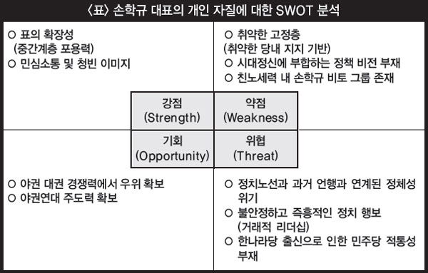 ¼Õ ´ëÇ¥ÀÇ ÃÖ´ë ¾àÁ¡(Weakness)Àº ´ç³» ±â¹ÝÀÌ Ãë¾àÇÒ »Ó¸¸ ¾Æ´Ï¶ó ¹Ú±ÙÇý(ÚÓÐÇû³) Àü ´ëÇ¥³ª À¯½Ã¹Î ´ëǥó·³ °ß°íÇÑ ÁöÁöÃþÀ» °®°í ÀÖÁö ¸øÇÑ Á¡ÀÌ´Ù. À۳⠴ëÇ¥ÃëÀÓ ÀÌÈÄ ÇöÀç±îÁö ¼Õ ´ëÇ¥ÀÇ ÁöÁöµµ°¡ 15%¸¦ ³ÑÁö ¸øÇÏ´Â ÀÌÀ¯µµ ¿©±â¿¡ ÀÖ´Ù. ¹Ú Àü ´ëÇ¥ÀÇ °æ¿ì ¾Æ¹«¸® ÁöÁöµµ°¡ Ãß¶ôÇØµµ 20%´ë ¹ØÀ¸·Î ¶³¾îÁöÁö ¾Ê´Â ÀÌÀ¯´Â ¾î¶² »óȲ¿¡¼µµ ¹Ú Àü ´ëÇ¥¸¦ ÁöÁöÇÏ´Â ¡®Àý´ë °íÁ¤Ãþ¡¯ÀÇ ±Ô¸ð°¡ »ó´çÇϱ⠶§¹®ÀÌ´Ù.