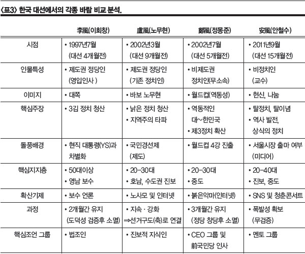 <Ç¥3>Àº ±×µ¿¾È Çѱ¹ ´ë¼±¿¡¼ °Å¼¼°Ô ºÒ¾ú´ø °¢Á¾ ¹Ù¶÷µé°ú ¾Èdz(äÌù¦¡¤¾Èö¼ö ¹Ù¶÷)À» ºñ±³¡¤ºÐ¼®ÇÑ °ÍÀÌ´Ù. À̸¦ Åä´ë·Î ¾ÈdzÀÇ ¹Ì·¡¸¦ ¿¹ÃøÇØ º¼ ¼ö ÀÖ´Ù.