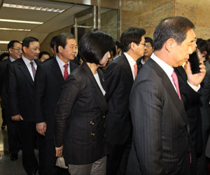 - 2011³â 12¿ù 13ÀÏ ¼¿ï ¿©Àǵµ ±¹È¸¿¡¼ ¿¸° Çѳª¶ó´ç ÀÇ¿øÃÑȸ°¡ ³¡³ ÈÄ Çѳª¶ó´ç ÀÇ¿øµéÀÌ ±»Àº Ç¥Á¤À¸·Î ȸÀÇÀåÀ» ³ª¼°í ÀÖ´Ù.