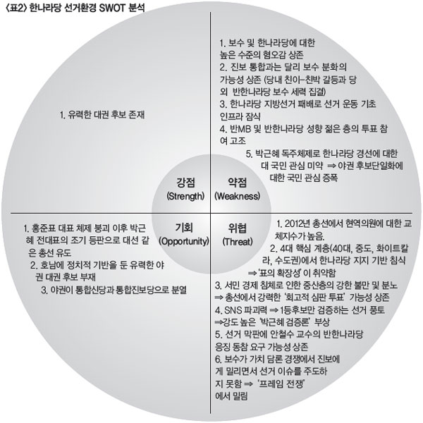 Çѳª¶ó´çÀÌ °®°Ô µÉ ±âȸ(Opportunity)´Â ÃѼ±¿¡¼ Á¤ºÎÀÇ ½ÇÁ¤À» Åä´ë·Î Áý±Ç´çÀ» ½ÉÆÇÇϱâ À§ÇÑ È¸°íÀû ÅõÇ¥ÀÇ ¼ºÇâÀÌ °ÇÏÁö¸¸ À¯·ÂÇÑ ´ë±Ç Èĺ¸ÀÎ ¹Ú±ÙÇý Àü ´ëÇ¥°¡ Àü¸é¿¡ ³ª¼¸é¼ ¼±°Å ºÐÀ§±â¸¦ ¹Ù²Ü ¼ö ÀÖ´Â ±âȸ¸¦ ¾òÀ» ¼ö ÀÖ´Ù. ´ë¼± °°Àº ÃѼ±À» À¯µµÇÏ¸é¼ À¯±ÇÀÚµé·Î ÇÏ¿©±Ý °ú°Å°¡ ¾Æ´Ï¶ó ¹Ì·¡¸¦ º¸°í ÅõÇ¥Çϵµ·Ï ÇÏ´Â ±âȸ°¡ ¿¸±Áöµµ ¸ð¸£´Ù. ½ÇÁ¦·Î ¡¶¼¿ï½Å¹®¡·ÀÌ 2010³â 7¿ù¿¡ ½Ç½ÃÇÑ ¿©·ÐÁ¶»ç¿¡ µû¸£¸é, À¯±ÇÀÚÀÇ 63.1%°¡ 2012³â 4¿ù ÃѼ±¿¡¼ ¡®12¿ù¿¡ ÀÖÀ» ´ëÅë·É ¼±°Å¸¦ ¿°µÎ¿¡ µÎ°í ÅõÇ¥ÇÒ °Í¡¯À̶ó°í ÀÀ´äÇß´Ù. ¾ß±ÇÀÇ À¯·ÂÇÑ ´ë±Ç È帵é Áß¿¡¼ È£³²À» Á¤Ä¡Àû ±â¹ÝÀ¸·Î Çϰí ÀÖ´Â »ç¶÷µéÀÌ ¾ø°í, ¾ß±ÇÀÌ ÅëÇսŴç°ú ÅëÇÕÁøº¸´çÀ¸·Î ºÐ¿µÇ¾î ¾ß±ÇÈĺ¸ ´ÜÀÏÈ È¯°æÀÌ Á¶¼ºµÇ±â ¾î·Æ´Ù´Â Á¡µµ ¶Ç ´Ù¸¥ ±âȸ¿äÀÎÀÌ´Ù.