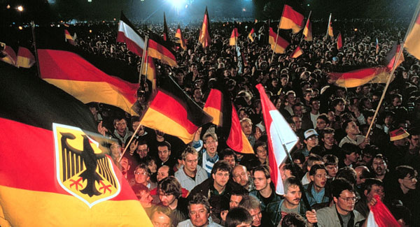 - 1990³â 10¿ù 3ÀÏ µ¶ÀÏÀÌ ÅëÀϵǴø ³¯, µ¶ÀÏÀεéÀÌ ºÐ´ÜÀÇ »ó¡ÀÌ´ø ºê¶õµ§ºÎ¸£Å©¹® ¾Õ¿¡¼ ±¹±â¸¦ Èçµé¸ç ȯȣÇϰí ÀÖ´Ù.