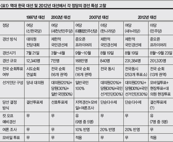 ÃÖ±Ù Çѱ¹ ´ë¼±ÀÇ ¿ª»ç´Â °æ¼±ÀÇ ¿ª»ç¶ó ºÒ¸± ¸¸Å °æ¼±ÀÌ Áß¿äÇÑ ´ë¼± À̺¥Æ®·Î ÀÚ¸® Àâ°í ÀÖ´Ù. Çѱ¹ ´ë¼±¿¡¼ °æÀïÀûÀÎ ´ç³» °æ¼±ÀÌ ÀÌ·ïÁø °ÍÀº 1997³â ½ÅÇѱ¹´ç °æ¼±, 2002³â »õõ³â¹ÎÁÖ´ç °æ¼±, 2007³â ´ëÅëÇÕ¹ÎÁֽŴç°ú Çѳª¶ó´ç °æ¼±ÀÌ´Ù. °¢ °æ¼±¸¶´Ù óÇÑ È¯°æ°ú Á¦µµÀû Ư¼ºÀÌ ´Ù¸£Áö¸¸ ºÐ¸íÇÑ °ÍÀº °æ¼± Á¦µµ°¡ ½Ã°£ÀÇ °æ°ú¿Í ´õºÒ¾î Á¶±Ý¾¿ ÁøÈÇϰí ÀÖ´Ù. <Ç¥1>Àº ¿ª´ë Çѱ¹ ´ë¼± ¹× 2012³â ´ë¼±¿¡ À̸£±â±îÁö °¢ Á¤´çµéÀÌ Ã¤ÅÃÇÑ °æ¼± Á¦µµÀÇ Æ¯¼ºÀ» °íÂûÇÑ °ÍÀÌ´Ù.