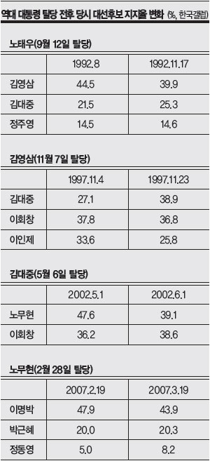 ÀÌ·± ºÐÀ§±â´Â ÃÖ±Ù °¶·´Á¶»ç¿¡¼ ÀÌ ´ëÅë·ÉÀÇ ÁöÁöÀ²ÀÌ 10%´ë·Î Ãß¶ôÇÑ °Í°ú ±íÀº °ü·ÃÀÌ ÀÖ´Ù. ±×·¡¼ 1987³â µµÀÔµÈ Á÷¼±Á¦·Î ¼±ÃâµÈ ¿ª´ë ´ëÅë·ÉÀÌ ¸ðµÎ ¸·ÆÇ¿¡ ·¹ÀÓ´ö¿¡ ½Ã´Þ¸®´Ù°¡ Áý±Ç´çÀ» ¶°³µ´ø °Í°ú ¶È°°Àº »óȲÀÌ À̹ø¿¡µµ ¹ú¾îÁú °¡´É¼ºÀÌ ³ô´Ù´Â Àü¸ÁÀÌ ³ª¿À°í ÀÖ´Ù. ³ë¹«Çö(ÒÆÙëúè) ´ëÅë·ÉÀº ´ë¼± 10°³¿ù Àü¿¡ Å»´çÇß°í, ±è´ëÁß(ÑÑÓÞñé) ´ëÅë·ÉÀº 7°³¿ù Àü¿¡ ´çÀ» ¶°³ª¾ß Çß´Ù. ³ëÅ¿ì(ÒÆ÷Áé×) ´ëÅë·ÉÀº 3°³¿ù Àü¿¡, °¡Àå ¿À·¡ ¹öƾ ±è¿µ»ï(ÑÑç¶ß²) ´ëÅë·ÉÀº 40¿© ÀÏ Àü¿¡ º¸µû¸®¸¦ ½Õ´Ù.
