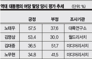 ´ç½Ã ±è´ëÁß ´ëÅë·ÉÀÇ Å»´ç¿¡ ´ëÇØ¼± ÀÌÀü ´ëÅë·ÉÀÇ °æ¿ì¿¡ ºñÇØ ±¹¹ÎµéÀÇ Æò°¡°¡ ºÎÁ¤ÀûÀ̾ú´Ù. 2002³â 5¿ù ¹Ìµð¾î¸®¼Ä¡ Á¶»ç¿¡¼ ±è´ëÁß ´ëÅë·ÉÀÇ Å»´ç¿¡ ´ëÇØ ÀÀ´äÀÚµéÀº ¡®±¹Á¤¿¡ Àü³äÇϱâ À§Çؼ¡¯(36.5%)¶ó´Â û¿Í´ë ¼³¸íº¸´Ù´Â ¡®±¹¸é Àüȯ¿ë À§Àå Å»´ç¡¯(51.7%)À̶ó´Â ¾ß´çÀÇ ºñÆÇ¿¡ µ¿Á¶ÇÏ´Â °ßÇØ°¡ ¸¹¾Ò´Ù.