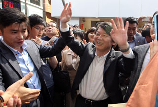 | 10¿ù 4ÀÏ ±¤ÁÖ ÃæÀå·Î¿¡¼ ½Ã¹Îµé°ú ÀλçÇÏ´Â ¾Èö¼ö Èĺ¸. È£³²ÀÇ ¡®Ãß¼® ¹Î½É¡¯Àº ¾È Èĺ¸¿¡°Ô À¯¸®ÇÑ ±¹¸éÀÌ´Ù. |