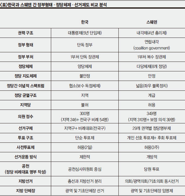 ½º¿þµ§°ú Çѱ¹Àº Á¤Ä¡¹®È, Á¦µµ, °ü½À, ±Ô¹ü µî ¿©·¯ ¸é¿¡¼ Å« Â÷À̰¡ ÀÖ´Ù. ºñ±³¹æ¹ý·ÐÀû ½Ã°¢¿¡¼ º¸¸é ¡®°¡Àå ¼·Î ´Ù¸¥ Á¤Ä¡Ã¼Á¦¡¯¶ó ÇÒ ¼ö ÀÖ´Ù. ÀÌ·¸°Ô »óÀÌ(ßÓì¶)ÇÑ Á¤Ä¡Ã¼Á¦¸¦ ºñ±³¡¤ºÐ¼®ÇÒ ¶§ ¾òÀ» ¼ö ÀÖ´Â °¡Àå Å« À̵æÀº »õ·Î¿î ½Ã°¢À¸·Î Á¤Ä¡¸¦ ¹Ù¶óº¼ ¼ö ÀÖ´Ù´Â °ÍÀÌ´Ù. ´Ù½Ã ¸»ÇØ, Çѱ¹ »çȸ°¡ ±×µ¿¾È ¼ºÃëÇÏÁö ¸øÇß´ø °ÍÀ» µ¶Æ¯ÇÑ ¹æ¹ýÀ¸·Î ÇØ°áÇÒ ¼ö ÀÖ´Â ½Ç¸¶¸®¸¦ ãÀ» ¼ö ÀÖ´Ù. <Ç¥>´Â Çѱ¹°ú ½º¿þµ§ °£ Á¤ºÎÇüÅ¡¤Á¤´çüÁ¦¡¤¼±°ÅÁ¦µµ¸¦ ºñ±³¡¤ºÐ¼®ÇÑ °ÍÀÌ´Ù. Á¤ºÎÇüÅ¿¡¼ Çѱ¹Àº 5³â ´ÜÀÓ(Ó¤ìò) ´ëÅë·ÉÁ¦¸¦, ½º¿þµ§Àº ÀÇ¿ø³»°¢Á¦¸¦ äÅÃÇϰí ÀÖ´Ù.