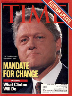 | 1992³â ¹Ì±¹ ´ë¼± ´ç½Ã Ŭ¸°ÅÏ ¹ÎÁÖ´ç È常¦ ½ÇÀº¡¶Å¸ÀÓ¡· Ç¥Áö. ¡®º¯È¸¦ À§ÇÑ Èĺ¸¡¯¶ó´Â Ç¥Á¦¾î°¡ ´«±æÀ» ²ö´Ù. |