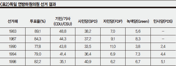 Á¦2Â÷ ¼¼°è´ëÀü Á¾Àü ÈÄ 50¿© ³â°£ µ¶ÀÏÀÇ Áøº¸ Á¤´çÀÎ »çȸ¹ÎÁÖ´ç(SPD)Àº ¸¸³â 2µîÀ̶ó ÇÒ Á¤µµ·Î ¼ö±Ç °æÀï¿¡¼ º¸¼ö Á¤´çÀÎ ±âµ¶±³¹ÎÁÖ´ç(CDU/CSU)¿¡ ¿¼¼¿´´Ù. 1990³â µ¶ÀÏ ÅëÀÏ ÀÌÈÄ¿¡µµ »ç¹Î´çÀÇ ¾à¼¼ Çö»óÀº Áö¼ÓµÇ¾ú´Ù.