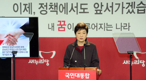 | 2012³â 11¿ù 16ÀÏ °æÁ¦¹ÎÁÖÈ °ü·Ã ±âÀÚȸ°ßÀ» ÇÏ´Â ¹Ú±ÙÇý ´ç½Ã »õ´©¸®´ç Èĺ¸. ¹Ú È帴 °æÁ¦¹ÎÁÖÈ µî ¾ß´çÀÇ ¾îÁ¨´Ù¸¦ ¼±Á¡ÇØ ´ë¼±¿¡¼ ½Â¸®Çß´Ù. |