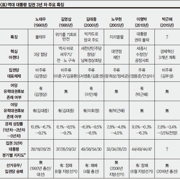°æÁ¦ º¯¼öµµ ´ëÅë·ÉÀÇ ÇâÈÄ ±¹Á¤ ¿î¿µ ÁöÁöµµ¿¡ °áÁ¤ÀûÀÎ º¯¼öÀÌ´Ù. ¹Ú±ÙÇý Á¤ºÎ Áý±Ç 1³â Â÷ ¶§ °æÁ¦ ¼ºÀå·üÀº 2.8%¿¡ ºÒ°úÇß°í, 2014³âÀº 3.4%¿¡ ±×Ä¥ °ÍÀ¸·Î º¸ÀδÙ. KDI´Â 2015³â Çѱ¹ °æÁ¦ ¼ºÀå·ü Àü¸ÁÀ» 3.5%·Î ³·Ãè´Ù. Á¤ºÎ°¡ ¹ßÇ¥ÇÑ 2014³â 3ºÐ±â ½ÇÁú ±¹¹Î ÃѼҵæ(GNI)ÀÌ Àü ºÐ±âº¸´Ù °Ü¿ì 0.3% ´Ã¾î³ª´Â µ¥ ±×ÃÄ 2³â6°³¿ù ¸¸¿¡ °¡Àå ³·Àº Áõ°¡À²À» ±â·ÏÇß´Ù. ±¹³» ÃÑ»ý»ê(GDP)µµ 4°³ ºÐ±â ¿¬¼Ó 0%´ë ¼ºÀå¿¡ ¸Ó¹°°í ÀÖ´Ù.