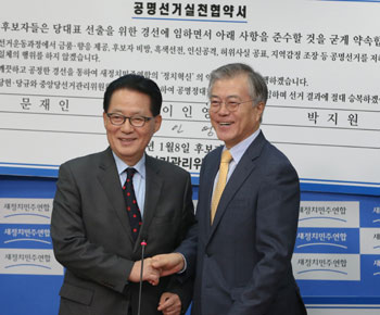 | »õÁ¤·Ã ´ç´ëÇ¥ °æ¼±¿¡ Ã⸶ÇÑ ¹®ÀçÀÎ Èĺ¸¿Í ¹ÚÁö¿ø È帴 1¿ù 8ÀÏ °ø¸í¼±°Å½ÇõÇù¾à¼¿¡ ¼¸íÇß´Ù. |