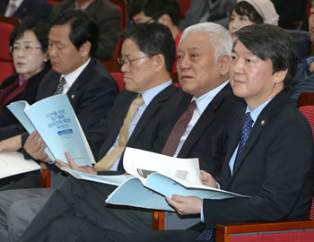 ´Ù¸¸, ¹Ú È帰¡ Áßµµ ¼ºÇâÀÇ ±èÇѱ桤¾Èö¼ö¿Í ¾î¶² ¿¬´ë¸¦ ÀÌ·èÇÒÁö°¡ ÃÖ´ë °ü½É»çÀÌ´Ù. ¾Èö¼ö ÀÇ¿øÀÇ Ãø±ÙµéÀÌ ÃÖ±Ù¿¡ ¹ß°£ÇÑ ¡¶¾Èö¼ö´Â ¿Ö?¡·¶ó´Â ´ë´ãÁý¿¡¼ ¾È ÀÇ¿ø°ú ¹®ÀçÀÎ ÀÇ¿ø°úÀÇ ´ÜÀÏÈ¿¡ ´ëÇØ ¡°2012³â ¶§·Î µ¹¾Æ°¡¸é ¹®ÀçÀÎ ÀÇ¿ø°ú ´ÜÀÏȸ¦ ÇÏÁö ¾Ê°Ú´Ù¡±°í Áø¼úÇß´Ù.