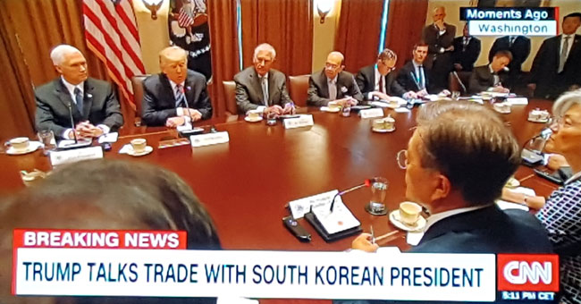 | ijºñ´Ö ·ë(Cabinet Room)¿¡¼ Æ®·³ÇÁ ´ëÅë·É°ú ºñ¼ÁøÀÌ Çѱ¹ Ãø¿¡ FTA¿¡ ´ëÇØ¼ ¼³¸íÇϰí ÀÖ´Ù. »çÁø=CNN ¹æ¼Ûȸé ÃÔ¿µ |