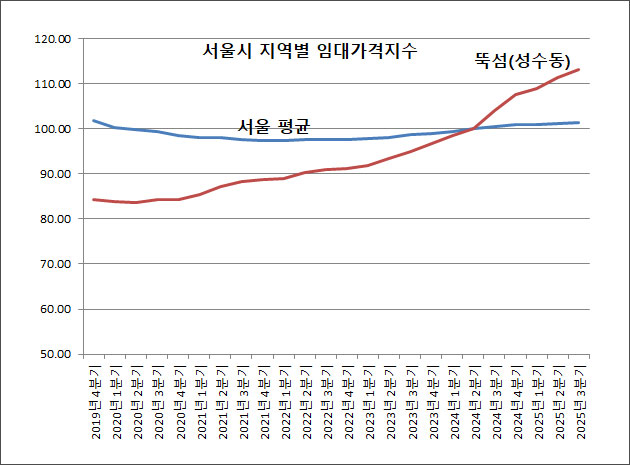 ±×·³ ¼ºµ¿±¸°¡ ¼º¼öµ¿ Áö¼Ó°¡´É¹ßÀü±¸¿ªÀ» È®´ë ÁöÁ¤ÇÑ ÈÄ »óȲÀº ´Þ¶óÁ³À»±î? ±àÁ¤ÀûÀ¸·Î Æò°¡Çϱâ´Â ½±Áö ¾Ê´Ù. Çѱ¹ºÎµ¿»ê¿øÀÇ ¡®ÀӴ뵿Çâ-Áö¿ªº° ÀÓ´ë·á¡¯ Åë°è¿¡ µû¸£¸é È®´ë ÁöÁ¤ ÀÌÈÄ 2025³â 3ºÐ±â±îÁö ¼¿ï Àü¿ªÀÇ ¼Ò±Ô¸ð »ó°¡ ÀÓ´ë·á »ó½Â·üÀº 4.6%´Ù. ¸íµ¿Àº 2.1%, °³²´ë·Î´Â -4.8%, È«´ë¡¤ÇÕÁ¤Àº 7.6%´Ù. °°Àº ±â°£ ¼º¼öµ¿ »ó±ÇÀÎ ¶Ò¼¶ÀÇ ÀÓ´ë·á »ó½Â·üÀº 20.8%¿¡ À̸¥´Ù. ¼¿ï Æò±ÕÄ¡ÀÇ 4.5¹è¿¡ ´ÞÇÏ´Â »ó½Â·üÀÌ´Ù. ÀÌ¹Ì ÆøµîÇÑ ¼º¼öµ¿ÀÇ ÀÓ´ë·á°¡ °è¼ÓÇØ¼ »ó´ëÀûÀ¸·Î °¡ÆÄ¸£°Ô ¿À¸£°í ÀÖ´Ù´Â »ç½ÇÀº ¼ºµ¿±¸ÀÇ Áö¼Ó°¡´É¹ßÀü±¸¿ª È®´ë ÁöÁ¤ ÀÌÈÄ¿¡µµ ÀÓ´ë·á »ó½Â ¾Ð·ÂÀÌ ½ÇÁúÀûÀ¸·Î ¿ÏȵÇÁö ¾Ê¾ÒÀ½À» º¸¿© ÁÖ´Â ´ë¸ñÀÌ´Ù.