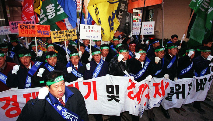 IMF ±¸Á¦±ÝÀ¶ ¹ßÇ¥ ÀÌÆ±³¯ÀÎ 1997³â 12¿ù 2ÀÏ ¿ÀÈÄ ¼¿ï ¸íµ¿¿¡¼ ¿¸° ±ÝÀ¶³ë·ÃÀÇ IMF ±¸Á¶Á¶Á¤¾È ¹Ý´ë Áýȸ. »çÁø=Á¶¼±DB¡ª Áö±ÝÀÇ Çѱ¹ °æÁ¦´Â ±×¶§¿Í ¿ÏÀüÈ÷ ´Ù¸£´Ù´Â °ÍÀÌÁÒ.