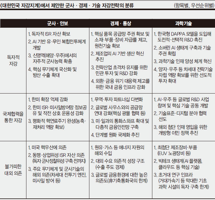 ¡°±º»ç¾Èº¸, °æÁ¦, °úÇбâ¼ú¿¡¼ ÀÚ° ´É·ÂÀ» Ű¿ö¾ß ÇÕ´Ï´Ù. ±º»ç ºÎ¹®¿¡¼´Â µ¶ÀÚ ISR(Intelligence, Surveillance, Reconnaissance¡¤Á¤º¸ °¨½Ã Á¤Âû) ÀÚ»êÀ» È®ÃæÇϰí, ųÀ¥(ºÏÇÑÀÌ ÇÙ¡¤¹Ì»çÀÏÀ» ¹ß»çÇϱâ Àü¿¡ »çÀ̹ö ÀÛÀü µîÀ» ÀÌ¿ëÇØ ±³¶õÇÒ ¼ö ÀÖ´Â ±º ÀÛÀü)À» ±¸ÃàÇØ ½Ã¹ü ¿î¿ëÇØ¾ß ÇÕ´Ï´Ù. ·¹ÀÌÀú ¹«±â ½ÃÁ¦Ç°À» °³¹ßÇϰí, Àü·«¹Ì»çÀϰú µå·Ð Àü·ÂÀ» ü°èÈÇØ¾ß ÇÕ´Ï´Ù. °æÁ¦¿¡¼´Â ÈñÅä·ùÀÇ ´ë(Óß) Áß±¹ ÀÇÁ¸µµ¸¦ °¨ÃàÇϰí, ¹ÝµµÃ¼ ¼ÒÀç ÀÚ±Þ·üÀ» Çâ»ó½ÃÄÑ¾ß ÇÕ´Ï´Ù. ¹Ì±¹, µ¶ÀÏ, ÀϺ»ÀÌ Àå¾ÇÇÏ´Â ¿øÃµ±â¼úÀ» ¿ì¸®°¡ È®º¸ÇÏ´Â °ÍÀÌ Áö»ó°úÁ¦ÀÔ´Ï´Ù. ¹æÀ§»ê¾÷ÀÇ ¼öÃâ ¿ª½Ã Áö¼ÓÀûÀ¸·Î È®´ëÇØ¾ß ÇÕ´Ï´Ù. °úÇбâ¼ú¿¡¼´Â ±¹°¡ R&D ¿¹»êÀ» Çõ½ÅÇϰí, ÷´Ü ÀÎÀ縦 ¾ç¼ºÇϸç, AI ¹ÝµµÃ¼ ±¹°¡ ÇÁ·ÎÁ§Æ®¸¦ ½ÃÇàÇØ¾ß ÇÕ´Ï´Ù. ÀÌ ¸ðµç °ÍÀ» Ȱ¿ëÇØ ¿ì¸®´Â ¹Ì±¹°úÀÇ °ü°è¸¦ °úÇбâ¼úµ¿¸Í, °æÁ¦µ¿¸ÍÀ¸·Î È®ÀåÇØ¾ß ÇÕ´Ï´Ù.