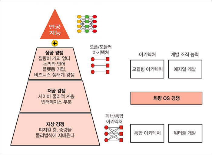 ¾ÕÀÇ [±×¸²1]¿¡¼ »ìÆìº» °Íó·³, °ú°ÅÀÇ ÀÚµ¿Â÷´Â ¡®Áö»óÀÇ ¹°¸®Àû ¿µ¿ª¡¯¿¡ ¸Ó¹°·¶´ø ±â°è¿´´Ù. ÀÚµ¿¿îÀüÀ̶ó´Â °ÍÀº Â÷·® ºÎǰ À§¿¡ À̰͵éÀ» À¯±âÀûÀ¸·Î Á¦¾îÇÏ´Â OS°¡ Á¸ÀçÇÏ´Â Àú°ø ¿µ¿ª(low sky), ±×¸®°í ¹æ´ëÇÑ µ¥ÀÌÅ͸¦ ÇнÀ½ÃŰ´Â »ó°ø ¿µ¿ª(high sky)°ú AI°¡ ¼·Î ¸é¹ÐÇÏ°Ô ÇùÁ¶ÇØ¾ß °¡´ÉÇÏ´Ù.