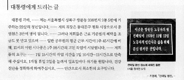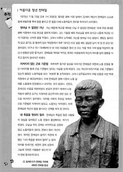 6Á¾ÀÇ Çѱ¹»ç ±³°ú¼°¡ °¡Àå ¸¹Àº Áö¸éÀ» ÇÒ¾ÖÇÏ¿© ºÎ°¢½ÃŲ Àι°Àº ºÐ½ÅÀÚ»ìÇÑ ³ëµ¿¿îµ¿°¡ ÀüÅÂÀÏÀÌ´Ù. ¹Ì·¡¿£ÄÃó±×·ì ±³°ú¼´Â 383ÆäÀÌÁö Àüü¸¦ ÇÒ¾ÖÇØ ÀüÅÂÀÏÀÇ »ý¾Ö¸¦ ÁýÁßÀûÀ¸·Î Á¶¸íÇß´Ù. õÀç±³À° ±³°ú¼µµ 380ÆäÀÌÁö <³ëµ¿°ú ³ó¹Î¿îµ¿>À̶ó´Â Á¦¸ñ¿¡¼ ÀüÅÂÀÏ °ü·Ã ±ÛÀ» ÇÑ ÆäÀÌÁöÀÇ 3ºÐÀÇ 1 °¡±îÀÌ ½Ç¾ú´Ù. ¡®´ëÅë·É¿¡°Ô µå¸®´Â ±Û¡¯°ú ÀüÅÂÀÏÀÌ ºÐ½ÅÇß´ø û°è6°¡(ʶ)¿¡ ¼¼¿öÁø µ¿ÆÇ »çÁøµµ ÷ºÎÇØ ±×¸¦ ºÎ°¢½ÃÄ×´Ù.