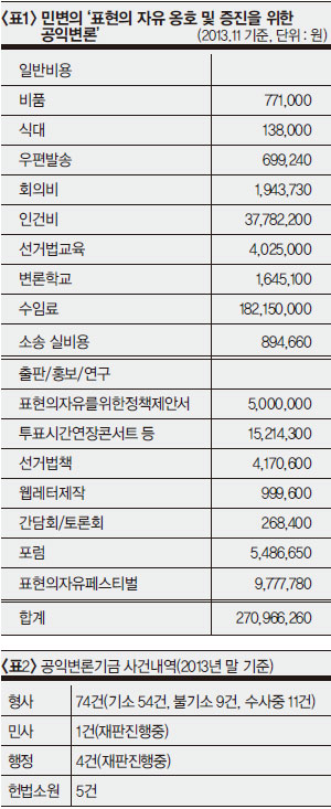 ±âºÎ±Ýǰ¹ý¿¡ µû¸£¸é µî·Ï ÈÄ ¸ðÁýµÈ ±â±ÝÀº 2³â ¾È¿¡ »ç¿ëÇÏ°í »ç¿ëó¸¦ µî·Ï±â°ü¿¡ Á¦½ÃÇØ¾ß ÇÑ´Ù. ¡®ÂÌÁö¸¶±â±Ý¡¯ÀÇ »ç¿ë ±âÇÑÀº 2014³â 2¿ù 26ÀϱîÁö´Ù. ¹Îº¯Àº Áö±Ý±îÁö ¼¼ Â÷·Ê¿¡ °ÉÃÄ <°øÀͺ¯·Ð±â±Ý ÈÄ¿ø½Ã¹ÎÀ» À§ÇÑ ´º½º·¹ÅÍ>¸¦ ¹ßÇàÇÏ°í ±âºÎÀڵ鿡°Ô »ç¿ë³»¿ª°ú ÇöȲÀ» °ø°³Çß´Ù.(Ç¥ 1¡¤2¡¤3 ÂüÁ¶) ¹Îº¯ Ãø¿¡ µû¸£¸é Áö±Ý±îÁö 85°ÇÀÇ ¼Ò¼Û°Ç¿¡ ´ëÇÑ ¼öÀÓ·á ¾à 1¾ï8000¸¸¿ø°ú ¡®Ç¥ÇöÀÇ ÀÚÀ¯¡¯ °ü·Ã Æ÷·³°ú À̺¥Æ® µî¿¡ ¾à 9000¸¸¿ø µî 2¾ï7000¿©¸¸¿øÀ» ÁöÃâÇß´Ù°í °ø°³Çß´Ù.