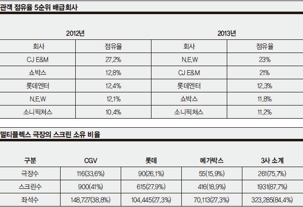 Á¦ÀÛ»çÀÇ Á¦¾ÈÀ¸·Î ÅõÀÚȸ»ç°¡ ÀÚ±ÝÀ» ÅõÀÔÇϰí, ¿µÈ­¸¦ ¸¸µé¸é ±ØÀå¿¡ ¿µÈ­¸¦ À¯ÅëÇÏ´Â ¿ªÇÒÀ» ¹è±Þ»ç°¡ ¸Ã´Â´Ù. ¿ì¸®³ª¶ó´Â Åë»ó ÅõÀÚȸ»ç°¡ ¹è±Þ»ç¸¦ °âÇÑ´Ù. CJ¡¤¼î¹Ú½º¡¤·Ôµ¥¡¤N.E.W. µî 4°³ ȸ»ç´Ù. ¿µÈ­¸¦ ±ØÀå¿¡ °Å´Â °ÍÀº ±ØÀå»ç¾÷ÀÚÀÇ ¸òÀÌ´Ù. ÀÌ ¿ª½Ã CJ¡¤¼î¹Ú½º¡¤·Ôµ¥ÀÇ Â÷Áö´Ù. CJ´Â CGV¶ó´Â ±ØÀå, ·Ôµ¥´Â ·Ôµ¥½Ã³×¸¶, ¼î¹Ú½º´Â ¸Þ°¡¹Ú½º¸¦ °®°í ÀÖ´Ù. À̵é 3»çÀÇ ½ºÅ©¸° Á¡À¯À²Àº 87.7%´Ù. ÅõÀÚ¹è±Þ»çÀÎ ¡®N.E.W.¡¯´Â ±ØÀåÀÌ ¾ø°í, 3»ç À̿ܿ¡ ¡®´ëÇѱØÀ塯°ú °°Àº °³ÀÎ ¼ÒÀ¯ÀÇ ±ØÀåÀÌ ÀϺΠÁ¸ÀçÇÑ´Ù.