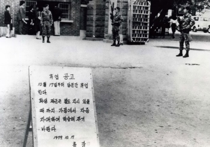 1979³â 10¿ù 17ÀÏ ´ëÇп¡´Â ÈÞ¾÷·ÉÀÌ ³»·È°í, À̳¯ ¹ã °è¾ö ¼±Æ÷ ÈÄ °ø¼öºÎ´ë°¡ ÁøÁÖÇß´Ù. ºÎ»ê µ¿¾Æ´ë ¾Õ. »çÁø=Á¶¼±DB